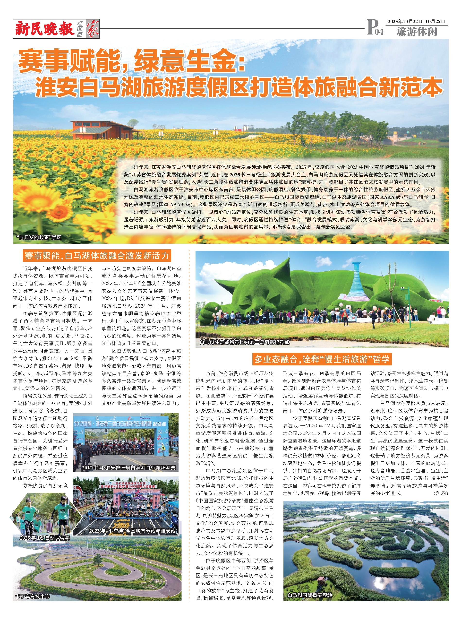 近年来,江苏省淮安白马湖旅游度假区在体旅融合发展领域持续取得突破。2023年,该度假区入选“2023中国体育旅游精品项目”,2024年斩获“江苏省体旅融合发展优秀案例”荣誉。近日,在2025长三角慢生活旅游发展大会上,白马湖旅游度假区又凭借其在体旅融合方面的创新实践,以及深度践行“慢生活”发展理念,入选“长三角慢生活旅游消费体验品质体旅目的地”荣誉榜,进一步彰显了其在区域文旅发展中的示范作用。