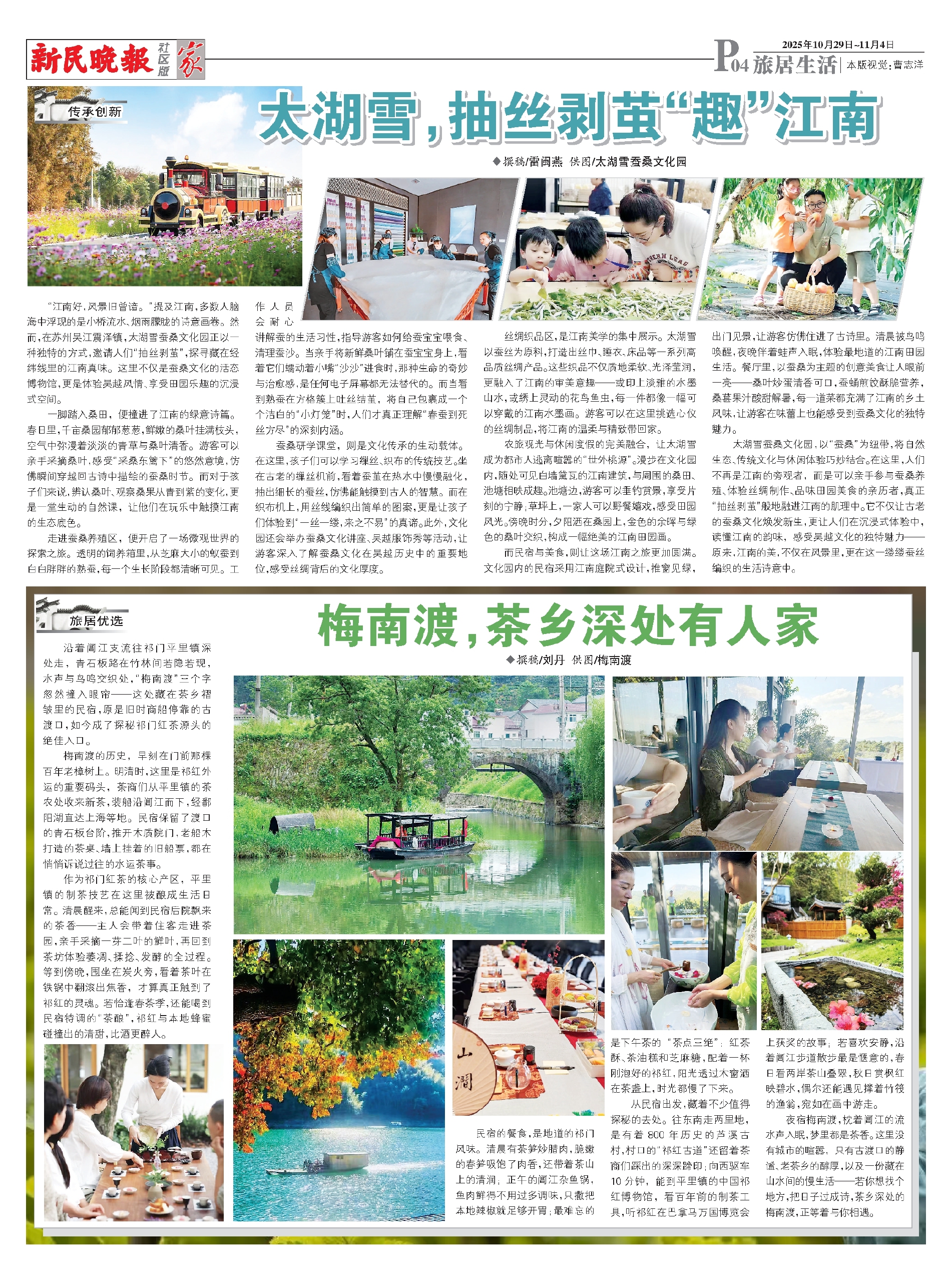 太湖雪蚕桑文化园,以“蚕桑”为纽带,将自然生态、传统文化与休闲体验巧妙结合。在这里,人们不再是江南的旁观者,而是可以亲手参与蚕桑养殖、体验丝绸制作、品味田园美食的亲历者,真正“抽丝剥茧”般地融进江南的肌理中。它不仅让古老的蚕桑文化焕发新生,更让人们在沉浸式体验中,读懂江南的韵味,感受吴越文化的独特魅力——原来,江南的美,不仅在风景里,更在这一缕缕蚕丝编织的生活诗意中。