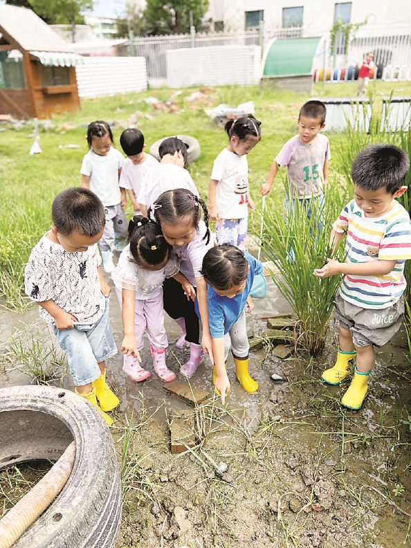 下雨时,“香泥湾”更显热闹。孩子们裹着雨衣、蹬着雨靴冲进泥地,溅起的水花混着清脆的笑声四处飞扬。远香湖幼儿园的老师说:“泥巴和雨水都是自然的一部分,让孩子亲手摸一摸、踩一踩,才是最真实的自然教育。”弄脏的衣服是“探索的勋章”,歪斜的小桥是“下一次成功的铺垫”。这片沾着泥泞的小天地,守护着童年最本真的模样,而那些溅在衣服上的泥点、搭歪的砖块、喂兔子时的灿烂笑脸,都是“香泥湾”写给孩子们的,关于自然与成长的温柔情书。