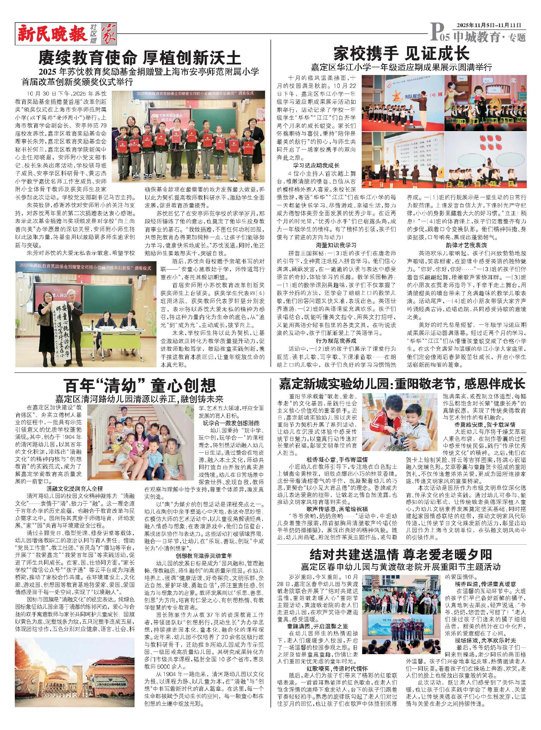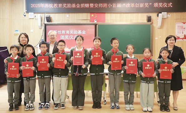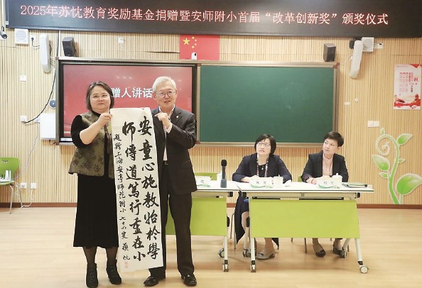10月30日下午,2025年苏忱教育奖励基金捐赠暨首届“改革创新奖”颁奖仪式在上海市安亭师范附属小学(以下简称“安师附小”)举行。上海市教育学会副会长、安亭师范79届校友苏忱,嘉定区教育奖励基金会理事长朱芳,嘉定区教育奖励基金会秘书长何兰,嘉定区教育学院新闻中心主任郑晓眉,安师附小党支部书记、校长朱英出席活动,学校领导班子成员、安亭学区科研骨干、黄志杰小学数学嘉优名师工作室成员、安师附小全体骨干教师及获奖师生及家长参加此次活动。学校党支部副书记马吉主持。