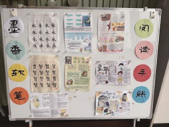 五年级的同学们以“妙笔书情表意”为基础活动。他们一个个拿起毛笔,当起了小小书法家,一笔一画写汉字。而在“阅读小手帐”的特色活动中,每个同学都认真品读经典书籍,将读书时的所思所想所感都记录下来,制作成元素丰富、生动有趣的个性化阅读手账,展现自己充满智慧的阅读收获。