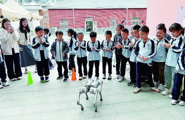 本次活动共设置10余个特色展位。在精灵机械狗展位区,机械狗不仅是趣味科技玩具,更是实用的多功能助手,能灵活完成行走、奔跑、跳跃等动作,轻松适应各类地形。在玩转智能机械臂展位区,搭载摄像头“眼睛”的机械臂,让同学们在互动游戏中体会科技服务生活的实用价值。在棋乐无穷展位里,黑白棋盘间上演人机智力对决,大家齐心协力共同挑战机器人大脑。在模拟飞行展位区,同学们通过团队协作完成空中领航任务,有效培养了他们的协作意识与空间思维。在VR元宇宙体验展位区中,学生们戴上特制头盔即可踏入逼真数字世界,在互动中探索多元学习方式与娱乐空间。在无人机穿环展位区,同学们遥控无人机穿梭于大小圆环间,沉浸式感受飞行员的职业体验。在极速赛车展位区,同学们兼顾速度与技巧,让赛车沿着赛道飞驰,尽享速度与激情。在DIY徽章机展位区,同学们发挥创意,亲手设计制作专属科技徽章。在足球小将展位区,足球机器人精准还原真实赛事形态,给大家带来了趣味十足的绿茵对决。