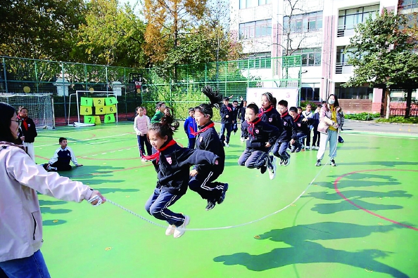 下午举行的花样跳绳体验活动,由闵行区跳绳协会和明强小学花样跳绳队全程提供专业支持。出席嘉宾包括:闵行区跳绳协会副会长杨俊丽、校级家委会成员暨民建上海市金融工委社会服务委执行主任秦晨晔、闵行区跳绳协会活动策划樊斌及高级教练崔煜东。全体师生观摩了明强小学花样跳绳队的精彩展演,精湛的技艺、富有创意的编排赢得了大家的阵阵掌声。随后,在专业教练手把手的指导下,各班学生热情高涨地参与花样跳绳基础动作学习,感受这项传统体育项目的独特魅力。与此同时,二至五年级每班选派6名学生参加了定向挑战活动,涵盖长绳B式、耐力跳挑战和交互绳体验3个项目。学生们在挑战中相互鼓励、配合默契,充分体现了团队协作精神。