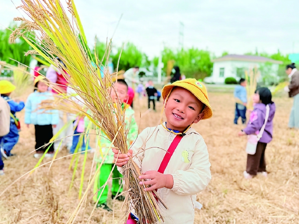 田埂上,孩子们轻轻抚摸稻穗、俯身细闻稻香、与水稻比身高,用不同的方式、多元的感官探索着秋天的稻田。体验环节中,孩子们在老师的帮助下尝试收割水稻,和小伙伴一起合力推草垛……简单的劳动,让孩子们体验到了别样的乐趣。