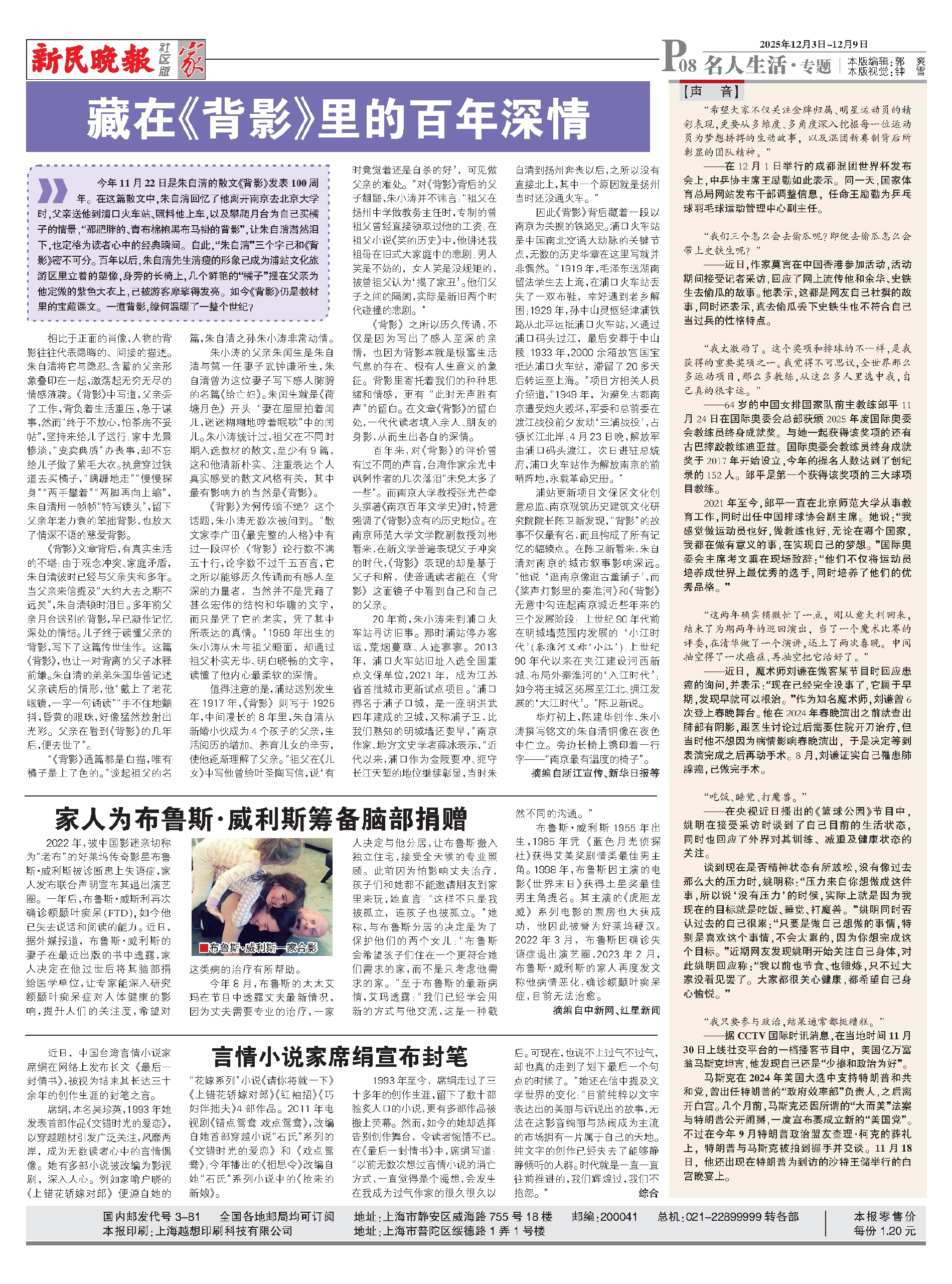 今年11月22日是朱自清的散文《背影》发表100周年。在这篇散文中,朱自清回忆了他离开南京去北京大学时,父亲送他到浦口火车站、照料他上车,以及攀爬月台为自己买橘子的情景,“那肥胖的、青布棉袍黑布马褂的背影”,让朱自清潸然泪下,也定格为读者心中的经典瞬间。自此,“朱自清”三个字已和《背影》密不可分。百年以后,朱自清先生清瘦的形象已成为浦站文化旅游区里立着的塑像,身旁的长椅上,几个鲜艳的“橘子”摆在父亲为他定做的紫色大衣上,已被游客摩挲得发亮。如今《背影》仍是教材里的宝藏课文。一道背影,缘何温暖了一整个世纪?