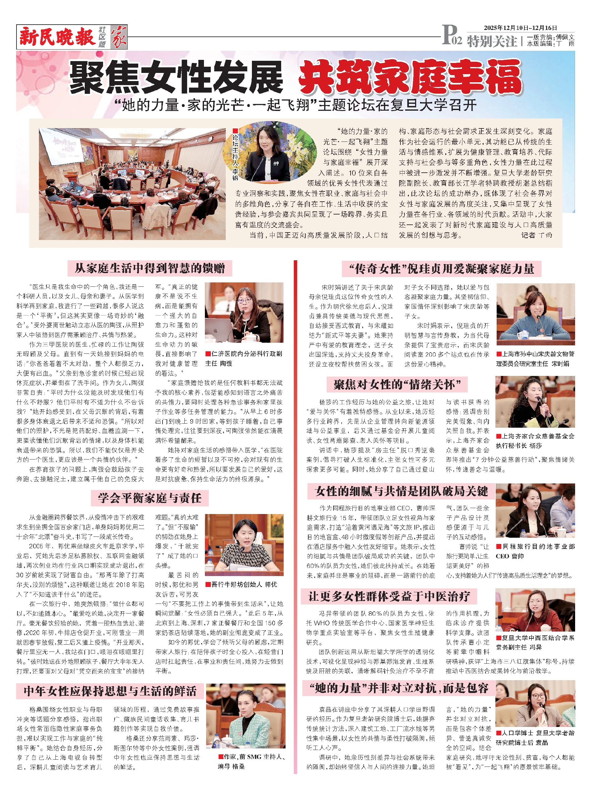 “她的力量·家的光芒·一起飞翔”主题论坛围绕“女性力量与家庭幸福”展开深入阐述。10位来自各领域的优秀女性代表通过专业洞察和实践,聚焦女性在职业、家庭与社会中的多维角色,分享了各自在工作、生活中收获的宝贵经验,与参会嘉宾共同呈现了一场跨界、务实且富有温度的交流盛会。