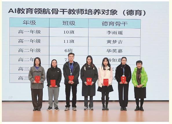 黄爱娟为首批骨干教师培养对象一一颁发证书。这一纸证书,既是学校对青年教师在教学工作中探索热情与成长潜力的充分肯定,也是对其“先行实践、以用促学、带动同仁”的郑重托付。他们将以学校“车头先锋”的身份,率先吃透AI技术核心、用活教育教学方法,在实践中总结可复制的经验,成为连接技术与教学的“传薪者”。副校长张蓓佳、校长助理周洁人分别宣读了学科教学、德育领域AI教育领航培养对象名单。