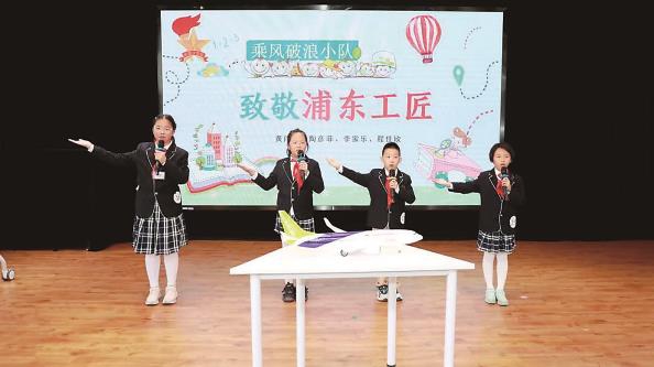 “乘风破浪小队”的程佳欣、黄雨萌、李家乐、陶彦菲4位队员,以“致敬浦东工匠”为主题,带领大家走进榜样人物的匠心世界。黄雨萌讲述了“创新超人”肖素枝研发无人机巡检软件的攻坚故事;陶彦菲介绍了C919“钣金大师”王伟精益求精的坚守历程;李家乐分享了古琴制作师杨致俭手工制琴的传承初心。队员们敏锐地发现,匠心并非遥不可及,早已融入校园的日常肌理:校长严谨治学的态度、老师们精心磨课的专注、队员们出黑板报的认真细致……都是工匠精神的生动践行。他们由此领悟,所谓工匠精神,正是把每件小事做到完美的坚守与执着。