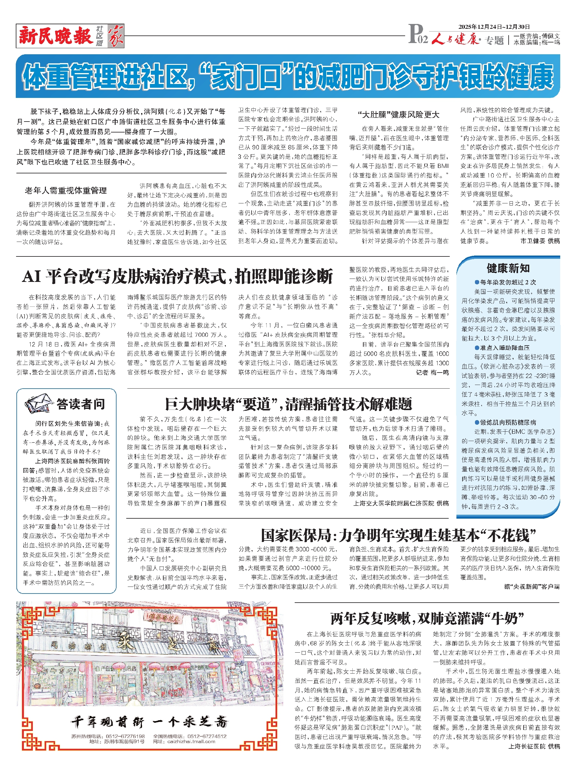广中路街道社区卫生服务中心主任周云庆介绍,体重管理门诊建立起“内分泌专家、营养师、中医师、全科医生”的联合诊疗模式,提供个性化诊疗方案。该体重管理门诊运行近半年,改变正在许多居民身上悄然发生:有人成功减重10公斤,长期偏高的血糖逐渐回归平稳;有人随着体重下降,膝关节疼痛明显缓解。
