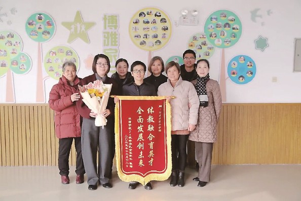 近日,闵行区华漕学校二年级游泳队学生的家长代表一行来到学校,送来鲜花与锦旗,感谢学校为学生提供了优质的游泳训练,对学生进行了悉心培养。华漕学校校长刘厚萍、副校长钱佳颖及体育分管老师冯守涛共同出席了活动。