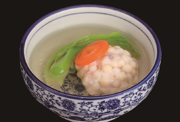 书中也详细介绍了鸡头米狮子头的具体操作方法:1.用少量虾胶把熟腊味粒、瑶柱丝和香芹碎粘合压实,制成较小的丸子待用,是谓A料。2.将鸡头米放入有盐、味精的汤中浸泡,使其获得底味,15分钟后捞起,自然沥干备用。3.把虾胶加鸡头米轻翻轻拌做成圆球,中间嵌入A料并捏紧,即成狮子头生坯。4.将狮子头生坯放入40℃清汤锅中,用小火煨至浮起,然后移至有滚清鸡汤的炖盅里,入蒸箱蒸4分钟后取出,放入同温配菜,加盖即可上桌。鸡头米颗粒如珠,兼有弹性,与猪肉虾茸兼容,入口香甜软糯。