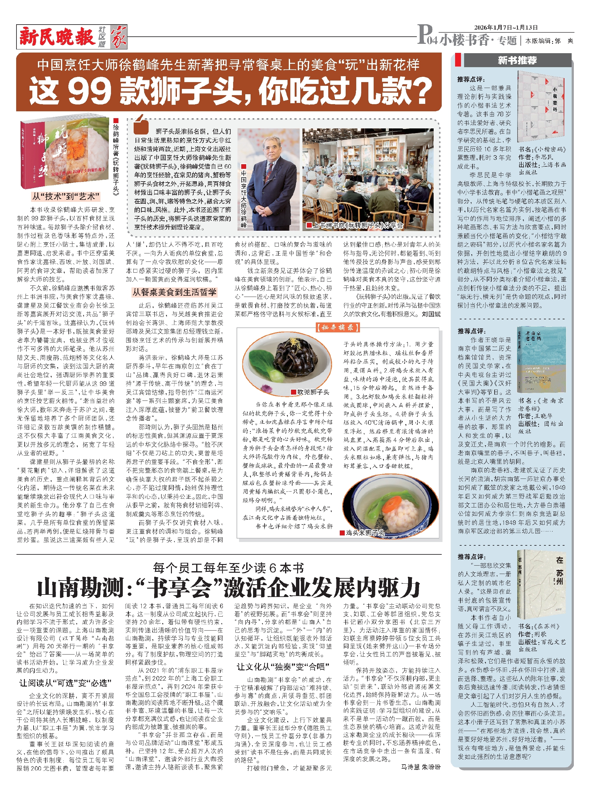 不久前,徐鹤峰应邀携书做客苏州上书洲书院,与美食作家沈嘉禄、龚建星及吴江餐饮业商会会长徐卫新等嘉宾展开对话交流,共品“狮子头”的千滋百味。沈嘉禄认为,《玩转狮子头》是一本好书,既被美食爱好者奉为饕餮宝典,也被业界才俊视作不可多得的大师笔录。他从苏州陆文夫、周瘦鹃、范烟桥等文化名人与厨师的交集,谈到法国大厨的高尚社会地位,强调厨师学养的重要性,希望年轻一代厨师能从这99道狮子头里“举一反三”,让中华美食的烹饪技艺薪火相传。“老当益壮的徐大师,数年来奔走于苏沪之间,毫无保留地培养了多个厨师团队,还详细记录数百款美馔的制作精髓。这不仅极大丰富了江南美食文化,更以开放多元的理念,拓宽了年轻从业者的视野。”