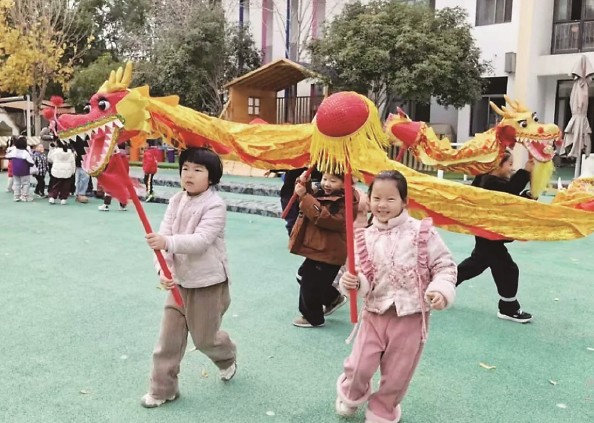 大班的运动项目兼具新年喜庆氛围与团队激情。“舞龙接力跑”中,孩子们举着龙道具奔跑、气势昂扬;“新年投壶”“跳绳闯关”等活动融合传统文化与体能挑战,引得孩子们踊跃参与;“两人三足”“拔河比赛”将活动推向高潮,呐喊声与欢笑声交织,凝聚成团结拼搏的集体力量。