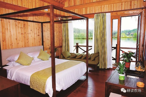 居住环境兼具舒适与野趣。21栋临湖木屋错落有致,推窗即见田园风光,内部设施完善却不失质朴,晨起听鸟鸣,夜宿观星斗。民宿周边还点缀着瓦罐、磨盘等乡土元素,留存着最纯粹的乡愁记忆。