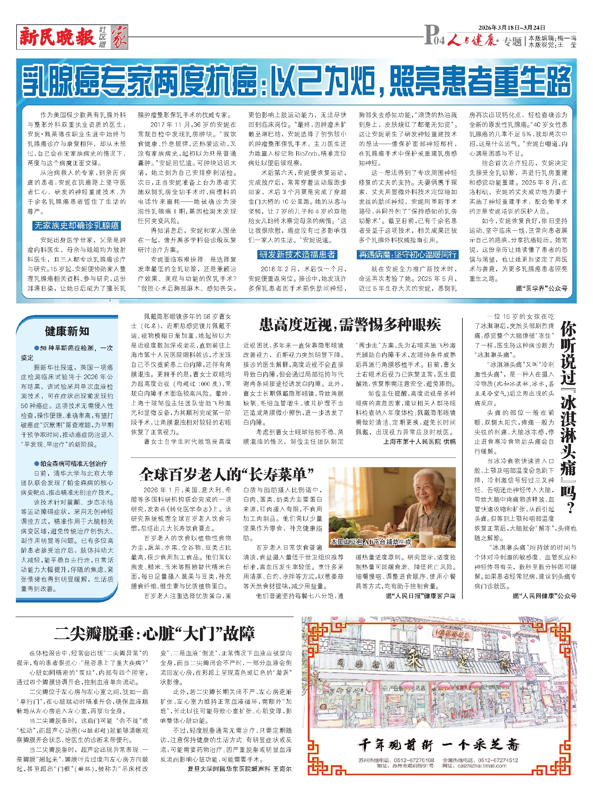 健康新知 你听说过“冰淇淋头痛”吗? 二尖瓣脱垂:心脏“大门”故障 患高度近视,需警惕多种眼疾 全球百岁老人的“长寿菜单” 广告 乳腺癌专家两度抗癌:以己为炬,照亮患者重生路