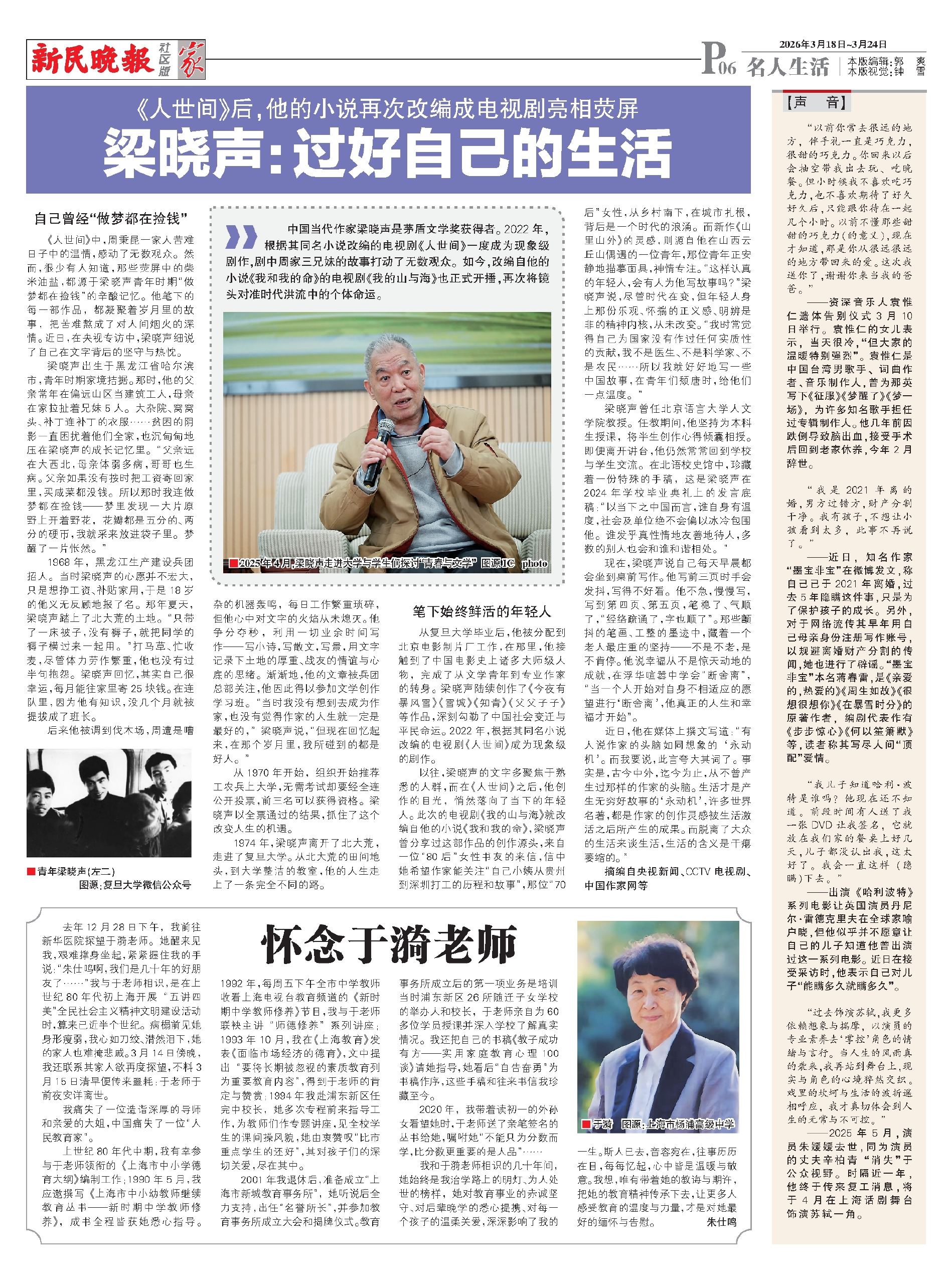 从复旦大学毕业后,他被分配到北京电影制片厂工作,在那里,他接触到了中国电影史上诸多大师级人物,完成了从文学青年到专业作家的转身。梁晓声陆续创作了《今夜有暴风雪》《雪城》《知青》《父父子子》等作品,深刻勾勒了中国社会变迁与平民命运。2022年,根据其同名小说改编的电视剧《人世间》成为现象级的剧作。