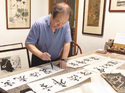 上海市书法家协会主席丁申阳的书法作品《寅虎添翼》,突出一个“情”字,字里行间充溢着力量和洒脱。丁申阳擅长草书和隶书,他的草书作品将篆隶线条与北碑转折相结合,气清质实,骨苍神腴,散发出一种流畅飘逸的才情;他的隶书作品拙近天真,朴近自然,不夸侈,不滞腻,浑厚苍茫。丁申阳的书法“寅虎添翼”为海派紫砂注入了浓浓的文人气息。