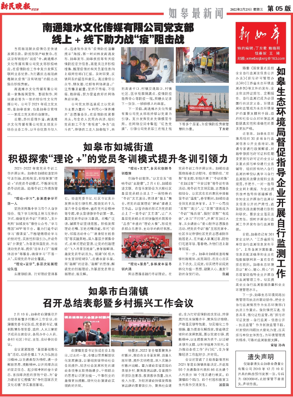 南通雉水文化传媒有限公司是一家集新闻宣传、影视制作、网站建设等为一体的综合性文化传媒公司,公司于2021年成立党支部,是如皋首家、也是如皋目前唯一一家成立党支部的自媒体。