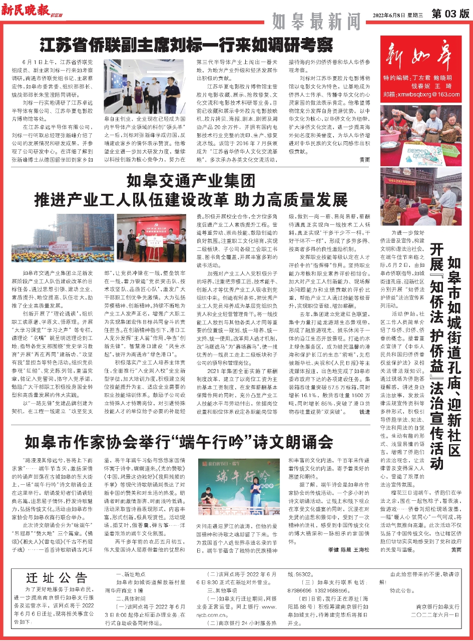 6月1日上午,江苏省侨联党组成员、副主席刘标一行来如考察调研。南通市侨联党组书记、主席蔡宏伟,如皋市委常委、组织部部长、统战部部长朱莹滢陪同调研。