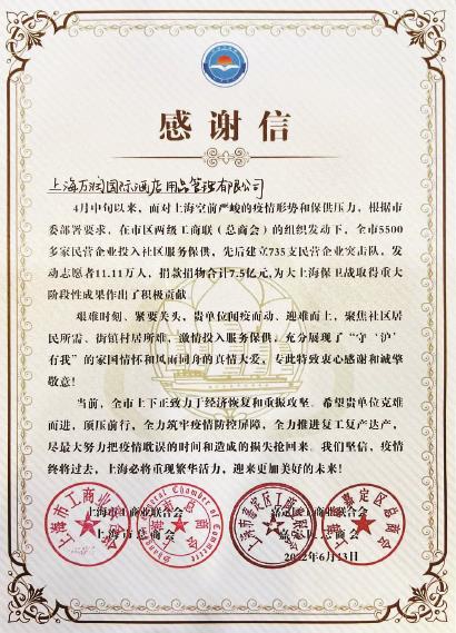 郑宝芳介绍,在“疫情”防控期间,真新街道党工委郭亦鹿书记多次带领党政班子领导深入上海万润国际酒店用品市场指导抗疫、倾听企业困难,为企业排忧解难。近日,沈元雄主任代表真新街道党工委和嘉定区总商会给“万润国际”送来感谢信,表扬“万润国际”的闻疫而动,迎难而上,聚焦社区居民所需,街镇村居所难,激情投入服务保供;肯定“万润国际”在这场艰苦卓绝的“大上海保护战”中,充分展现了“守“沪”有我”的家国情怀和风雨同舟的企业家大爱精神;希望“万润国际”全力推进复工复产复市工作,努力把疫情耽误的时间和造成损失抢回来。