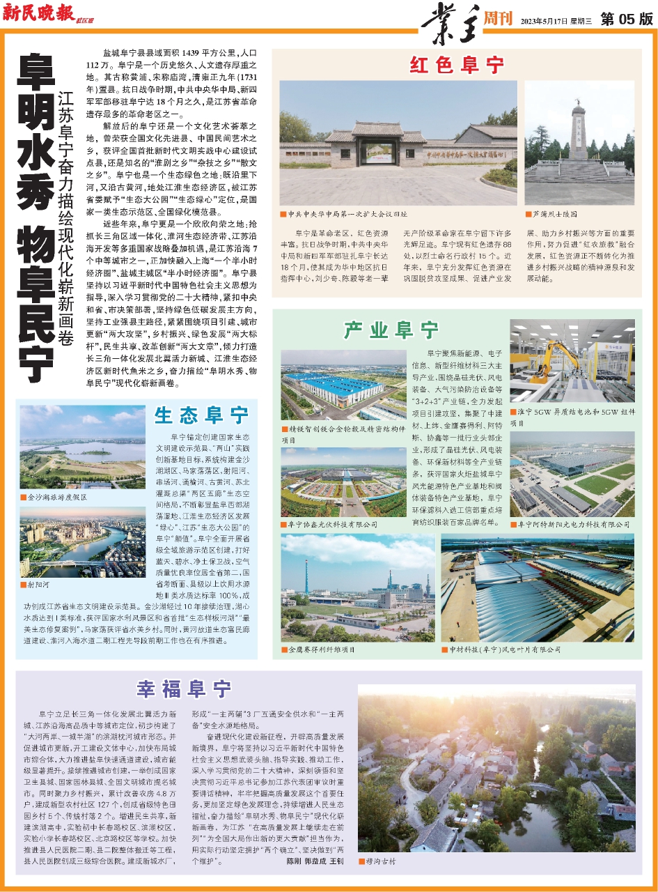 近些年来,阜宁更是一个欣欣向荣之地:抢抓长三角区域一体化、淮河生态经济带、江苏沿海开发等多重国家战略叠加机遇,是江苏沿海7个中等城市之一,正加快融入上海“一个半小时经济圈”、盐城主城区“半小时经济圈”。阜宁县坚持以习近平新时代中国特色社会主义思想为指导,深入学习贯彻党的二十大精神,紧扣中央和省、市决策部署,坚持绿色低碳发展主方向,坚持工业强县主路径,紧紧围绕项目引建、城市更新“两大攻坚”,乡村振兴、绿色发展“两大标杆”,民生共享、改革创新“两大文章”,倾力打造长三角一体化发展北翼活力新城、江淮生态经济区新时代鱼米之乡,奋力描绘“阜明水秀、物阜民宁”现代化崭新画卷。