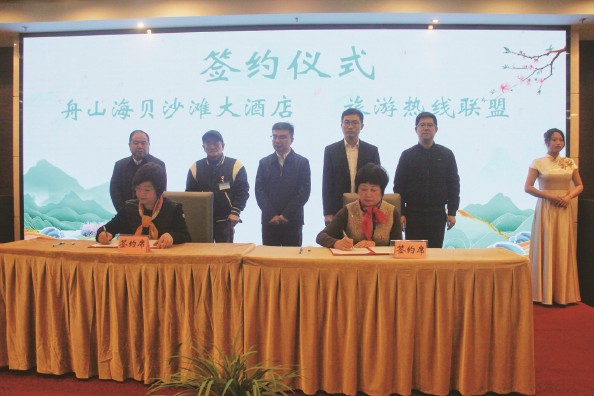 在随后的签约环节,桃花镇人民政府、舟山市普陀区桃花岛旅游开发投资有限公司、桃花海贝沙滩大酒店分别与旅游热线联盟签署了合作协议。
