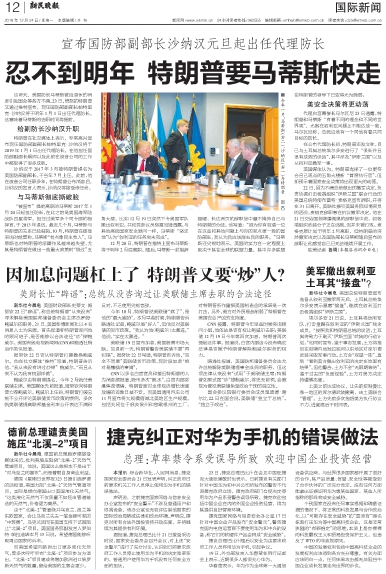 在公布代理防长后,特朗普还发文称,自己与土耳其总统埃尔多安进行了“很长并且很有成效的谈话”,其中涉及“伊斯兰国”以及从叙利亚撤军一事。