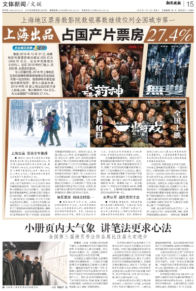 ●据统计,2018年上海全年立项备案电影283部,约占全国总数的8.2%。有35部上海出品的影片进入院线上映,累计票房约104亿元,比去年增长约110%。有12部影片票房过亿,其中1部过30亿元、3部过10亿元,上海出品影片票房约占全国国产片票房的27.4%。
