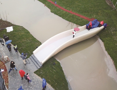 本报讯(记者 裘颖琼)昨日下午,国内第一座运用3D打印技术完成的一次成型、最大跨度、多维曲面高分子材料景观桥,正式落成于普陀区桃浦中央绿地。这座长15.25米、宽3.8米、高1.2米的曲面桥,在工厂里完成后,桥面又进行了艺术涂装,整座桥身呈香槟金色。