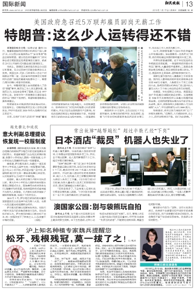 特朗普说,政府正努力减轻机构“关门”所致负面影响。“说真的,人们感到惊讶,这么少人,政府运转得还不错。我们为此骄傲。”
