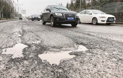 在徐汇区龙吴路上,从银都路到华泾路上短短近1000米路面坑坑洼洼,驾驶员形容这条马路为城市中的越野地,仿佛在走“弹硌路”,一到雨天坑里溢出的泥浆给整条街似洒了一层泥浆水,泥泞不堪。 栗荣摄