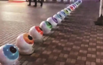 近日,有不少途经杨浦区国定路政民路的市民发现,路口的石礅子上多出了几只“眼睛”,每到晚上,不少路人会觉得,石礅子在向着自己“翻白眼”,有点吓丝丝。但也有市民觉得,这样的设计不错,挺动感。记者从五角场街道市政科获悉,截至目前,并未有任何声称创作相关“作品”的个人或单位来向街道报备。