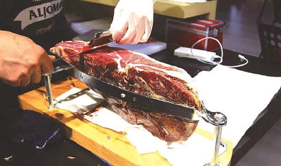 办年货的话,首推7号馆(进口食品与美妆用品)。亲朋聚会、走亲访友,可以到这里囤些酒水;西班牙网红火腿蓝恩喜诺,据说有长达1000年制造火腿的历史,现场切片,薄而不断,技术也是一绝;来自伊比利亚的黑猪肉,吃橡果树长大,腌制12到36个月,价格由猪肉成分不同比例、腌制时间决定。