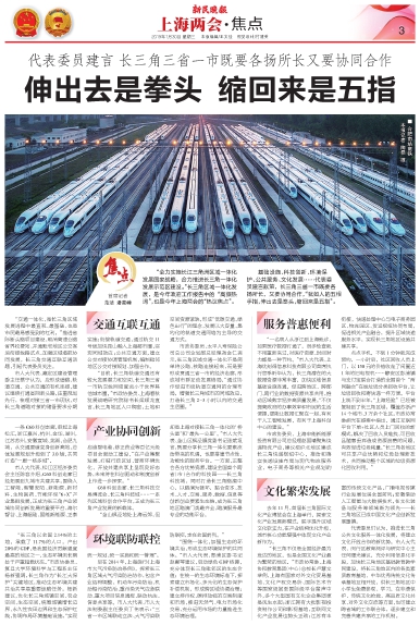 “全力实施长江三角洲区域一体化发展国家战略,合力推进长三角一体化发展示范区建设。”长三角区域一体化发展,是今年政府工作报告中的“高频热词”,也是今年上海两会的“热议焦点”。基础设施、科技创新、环境保护、公共服务、文化发展……代表委员建言献策,长三角三省一市既要各扬所长,又要协同合作,“犹如人的五根手指,伸出去是拳头,缩回来是五指”。