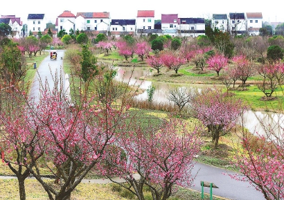 金山区花开海上生态园内,大片的梅林与小溪、村庄形成一幅美丽的田园画 本报记者 陶磊 摄