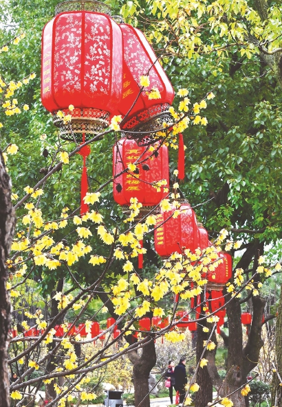 真如公园内的蜡梅与火红的灯笼营造出浓浓的新春气息 本报记者 孙中钦 摄
