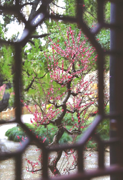 古猗园内,传统的梅花盆景造型打造出一片古意 本报记者 周馨 摄