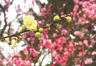 洁白的绿萼与粉红、玫红的梅花争奇斗艳 本报记者 周馨 摄