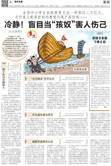 “育儿经费在支出中呈上升趋势,这表明家庭在各种刚需得以实现之后,有能力承担更多的教育支出,这是恩格尔系数下降的原因之一,也是消费升级提质的表现。”华东师范大学城市发展研究院社会学博士张海娜说,重视孩子的教育,将其视为人力资本的投资,这固然无可厚非,但是过度和过高的家庭教育消费,则需要关注并加以引导。对于国家经济发展而言,家庭盲目的、超过承受能力的支出过高,会发出错误的市场信号,导致教育培训等产业的过量投资,还会对正常的教育教学秩序产生一定的冲击。