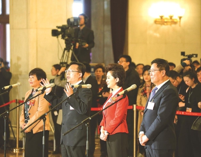 贵州省盘州市淤泥乡岩博村党委书记余留芬、联通研究院院长张云勇、央视主播海霞和首都医科大学附属北京同仁眼科中心主任王宁利(从左至右)昨天来到“委员通道”本版摄影特派记者张龙