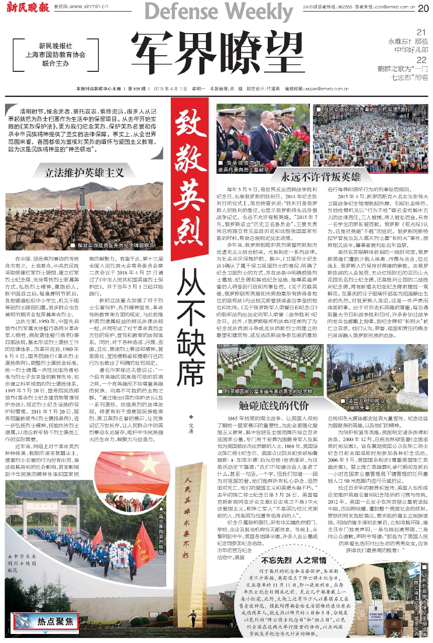 清明时节,悼念逝者、寄托哀思、慎终追远,很多人从记事起就把为烈士扫墓作为生活中的保留项目。从去年开始实施的《英烈保护法》,更为我们纪念英烈、保护英烈名誉和传承中华民族精神提供了坚实的法律保障。事实上,从全世界范围来看,各国都极为重视对英烈的缅怀与爱国主义教育,因为这是民族精神里的“神圣领地”。