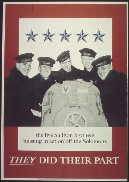 如同参军时一样,“战斗的五兄弟”再次成为美国民众的偶像——忠诚、勇敢和献身的偶像。为避免类似悲剧,国会特别通过“苏利文法案”,规定同一家族的同胞兄弟不得全上前线,即“单独存活者政策”。