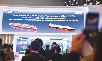 今天上午,沪东中华造船厂展台举行了27万立方米LNG运输船联合开发协议的签约仪式本报记者陈梦泽摄