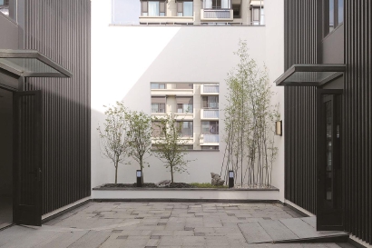 在高层建筑中的第三个垂直维度,作为整片建筑的亮点,余迅引入了上海里弄庭院的概念,称之为“空中的石库门”,借用上海传统建筑意象,来打破现代社区鸽子笼“老死不相往来”的生活方式,构建邻里公共空间。