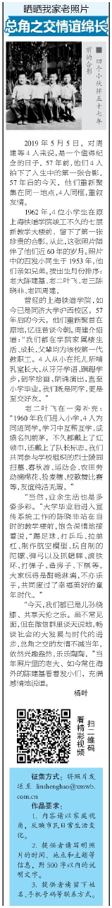 “今天,我们都已是儿孙绕膝、共享天伦之乐。虽不常见面,但在微信群里谈天说地,畅谈社会的大发展与时代的进步,总角之交的友情不减当年,依然兴趣盎然,乐乐陶陶。”当年照片里的老大、如今常住海外的陈建基看着发小们,充满感情地说道。