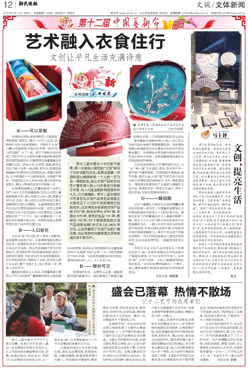 第十二届中国艺术节已落下帷幕,第一次被纳入框架的“文创”吸引了许多话题与关注。如果说观看一次剧场演出能够影响一个人的一天乃至一周的生活,那么文创产品把文化艺术普及深入到人们衣食住行的各个方面,对人们生活的影响就是长长久久、点点滴滴的。第十二届中国艺术节演艺及文创产品博览会场面之火爆佐证了人们对于美在细微之处的追求。此次博览会参展的文创产品共5757种,其中文博类4797种、非遗类679种、演艺衍生品131种、旅游类150种,33个特装展区的文创产品销售金额(含订单)达3400多万元,让业内看到了文创产业的广阔前景,也让传统文化能够通过多种渠道走进千家万户。