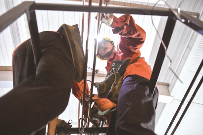 ◆今天凌晨,耗时不到3小时,施工人员顺利更换3072米承力索 本版摄影 记者 陈梦泽