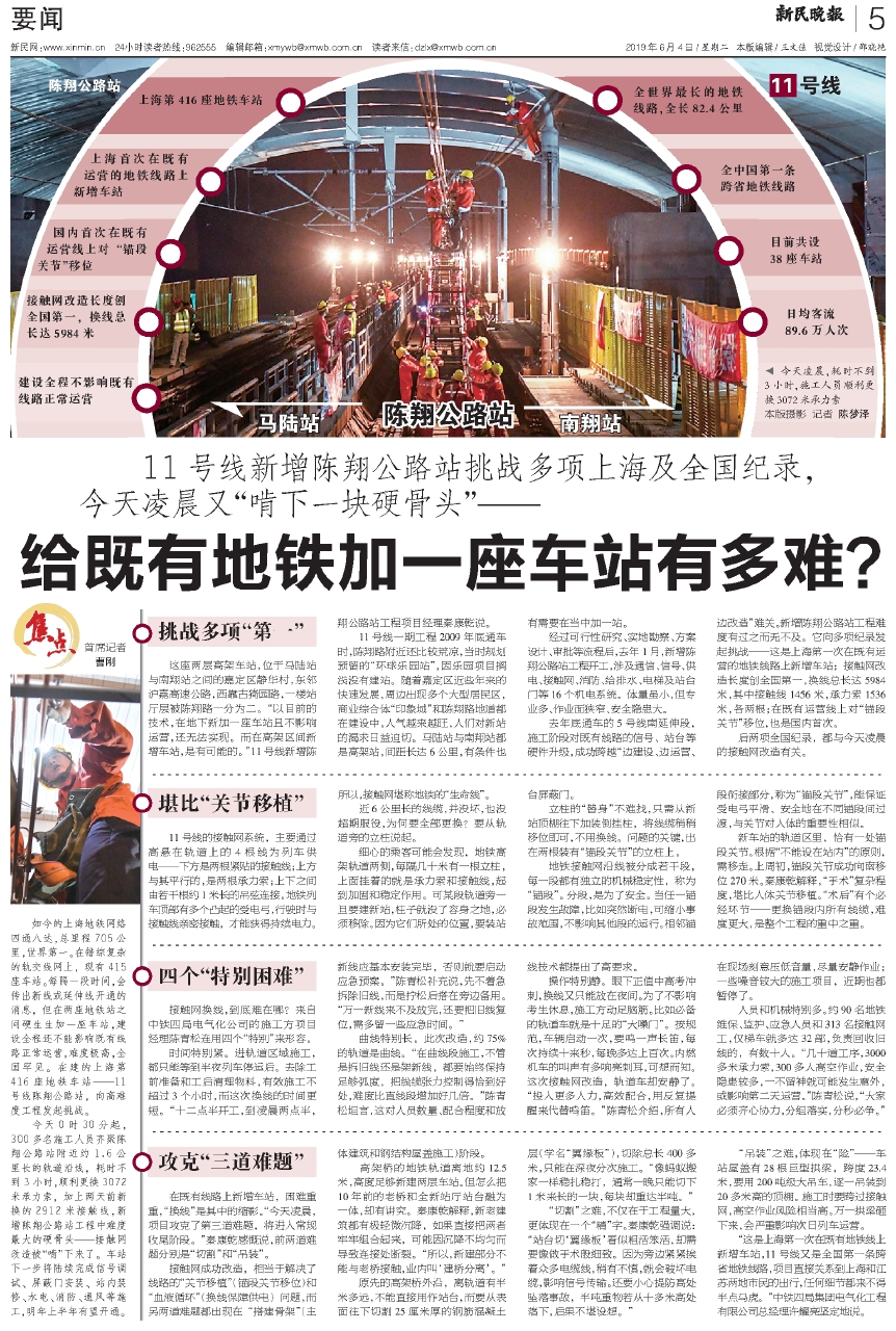 去年底通车的5号线南延伸段,施工阶段对既有线路的信号、站台等硬件升级,成功跨越“边建设、边运营、边改造”难关。新增陈翔公路站工程难度有过之而无不及。它向多项纪录发起挑战--这是上海第一次在既有运营的地铁线路上新增车站;接触网改造长度创全国第一,换线总长达5984米,其中接触线1456米,承力索1536米,各两根;在既有运营线上对“锚段关节”移位,也是国内首次。
