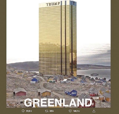 另外,特朗普19日在社交媒体推特作出“承诺”,不会在格陵兰岛建造特朗普国际酒店。特朗普在“推特”转发一张合成图片,显示金灿灿的特朗普国际酒店耸立在岩石海岸边,周围遍布颜色不一的低矮平房(见上图)。特朗普说:“我承诺,不会这样对待格陵兰岛。”