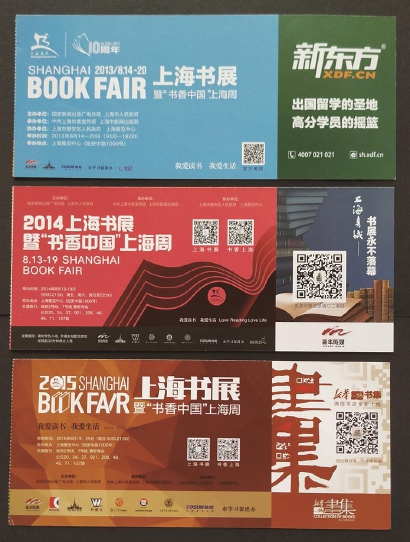 一是入场券设计从简单到丰富。2004年和2005年书展入场券,券面上仅印“上海书展”和日期、时间、地点,简单至极,毫无艺术感,我完全能理解这是初创阶段。2006年开始印有上海书展标识(logo),2009年呈现“我爱读书,我爱生活”正能量主题标语,2011年起冠名“书香中国”上海周。入场券设计日趋丰富多彩,正面精心设计彩色印制,背面是中国邮政明信片,便于邮寄留念。入场券有日场、夜场、指定日、团体、专场、赠券等。去年上海书展展出历届书展全套入场券,五彩缤纷的入场券吸引众多门券收藏爱好者驻足观赏。